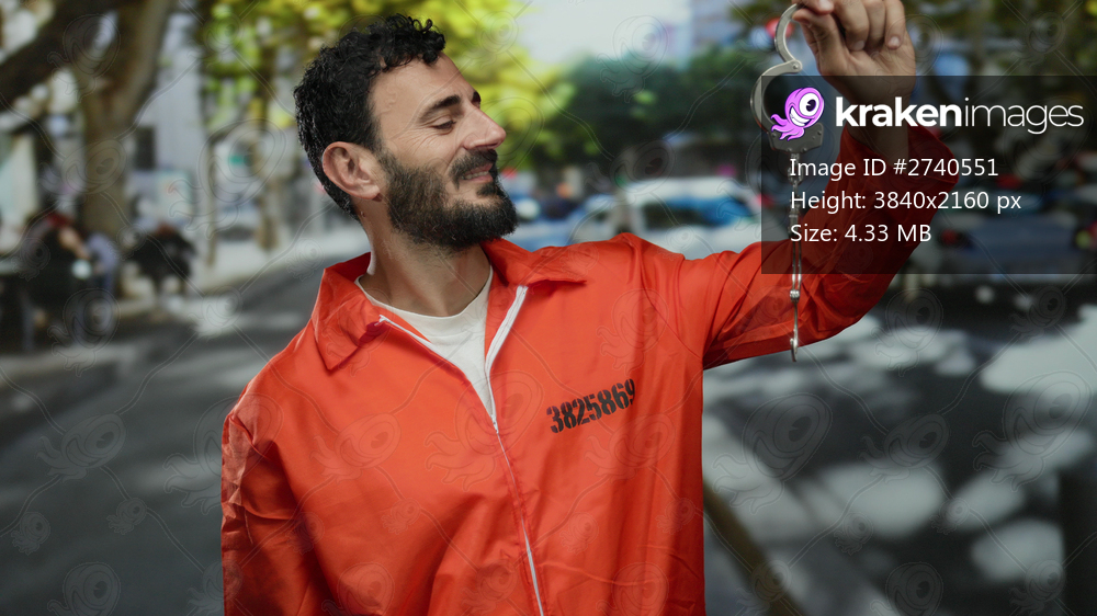 Hispanic man in orange jumpsuit stands on the street holding handcuffs, with a beard and a calm expression, implying a moment of freedom or contemplation outdoors. - Kraken Images