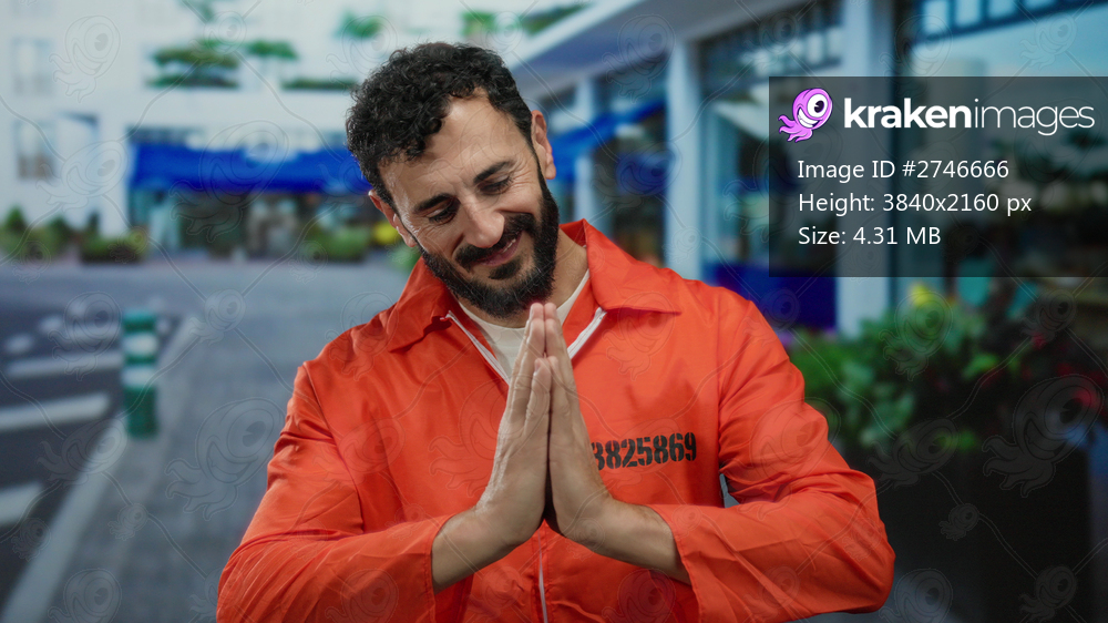Hispanic man in orange prison jumpsuit with a beard stands on the street with hands in prayer outdoors.