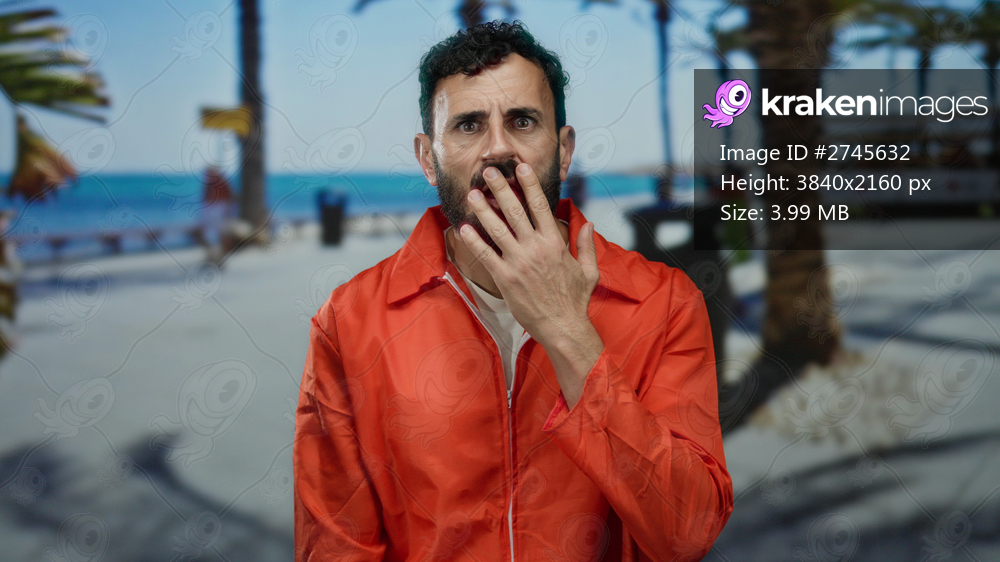 Hispanic man in orange prison jumpsuit with beard looking worried on a sunny beachfront promenade, palm trees around.
