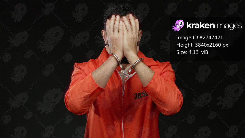 Hispanic man in orange prison jumpsuit covers face with handcuffed hands against a dark background, conveying solitude and distress in confinement.