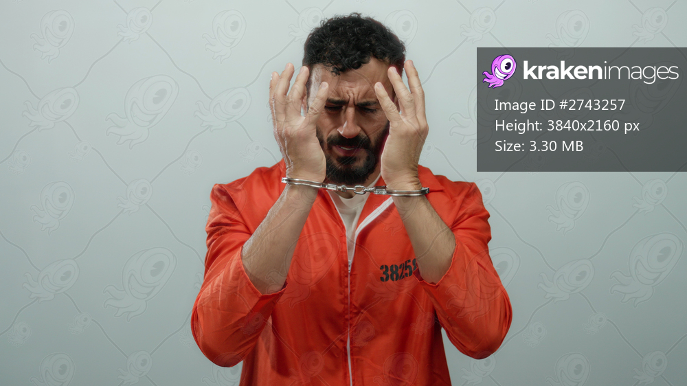 Hispanic man in orange prison jumpsuit with handcuffs covers face against grey background, representing incarceration and emotional distress.