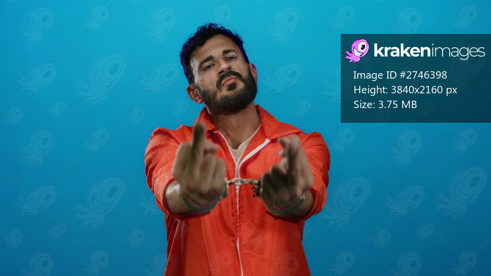 Hispanic man in orange prison jumpsuit with handcuffs poses against blue background conveying a dramatic scene of incarceration and defiance.