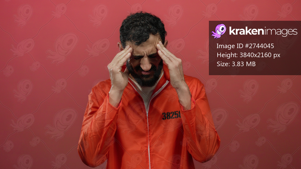 Hispanic man in orange prison jumpsuit stands against a red backdrop, looking stressed and holding his head.