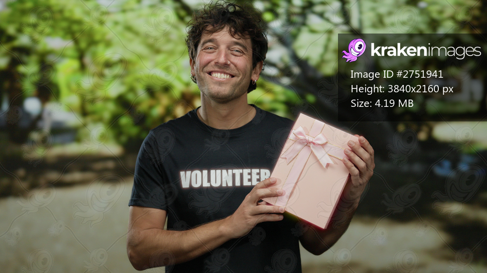 Hispanic man in park wearing volunteer shirt holds a pink gift box smiling amidst lush greenery showcasing generosity and happiness.