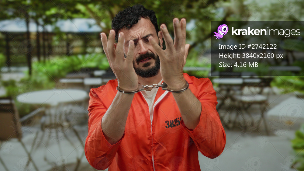 Hispanic man in prison jumpsuit looks distraught while handcuffed in an outdoor restaurant setting with empty tables visible in the background.