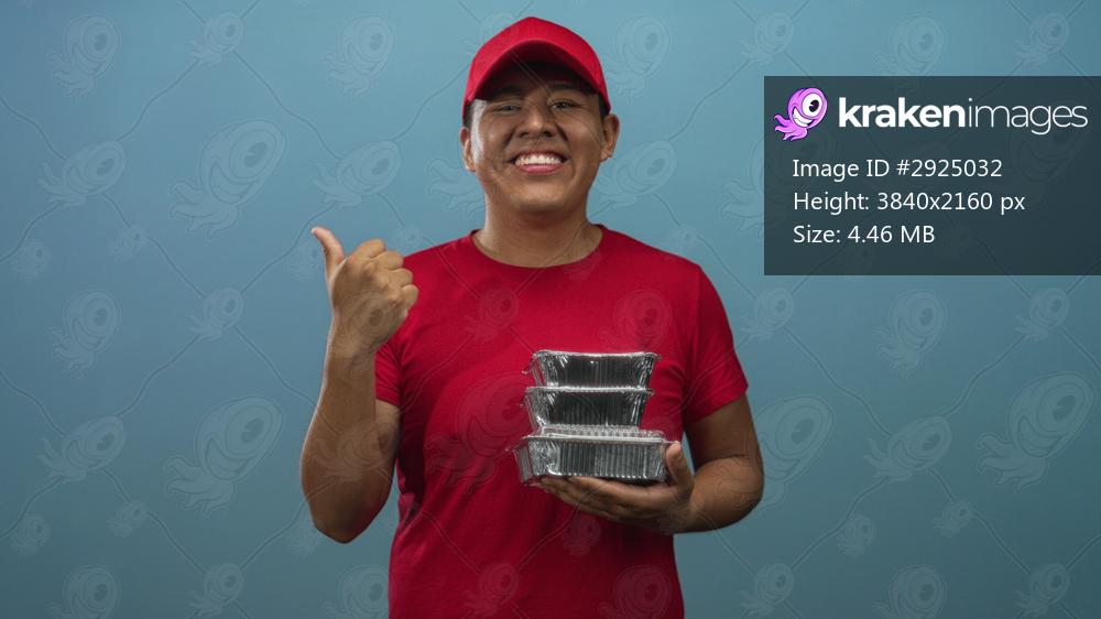 Hispanic man in red cap holding stacked foil food trays and giving a thumbs up in a blue studio; cheerful delivery service.