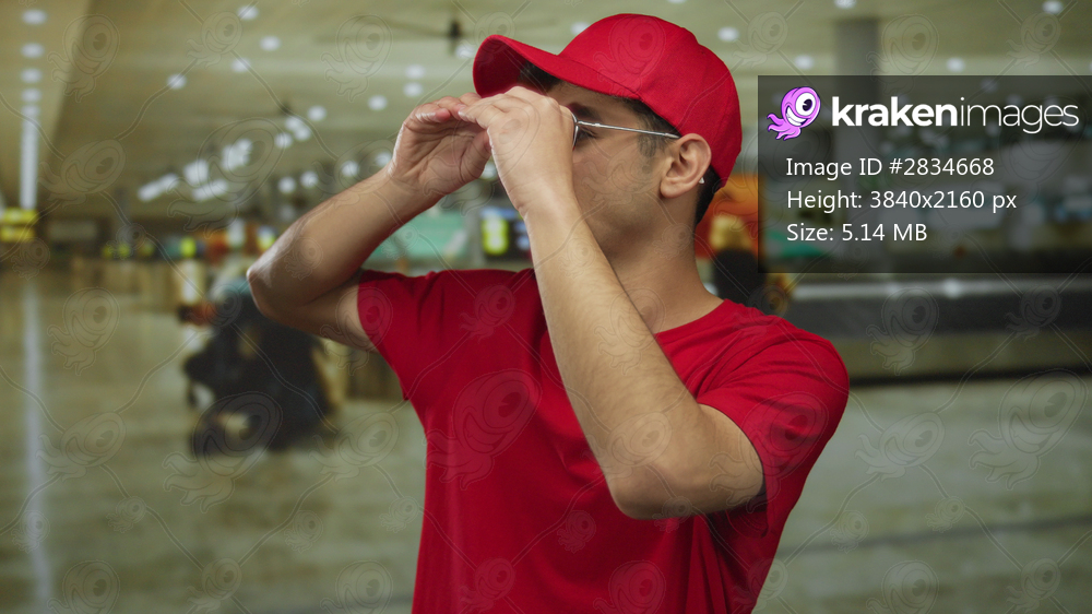 Hispanic man in red cap and red shirt adjusts glasses by baggage carousel in modern airport terminal hall; anticipation.