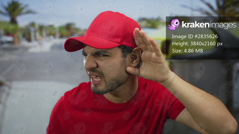 Hispanic man in red cap and tshirt cups hand to ear beside yellow recycling container on street; alertness.