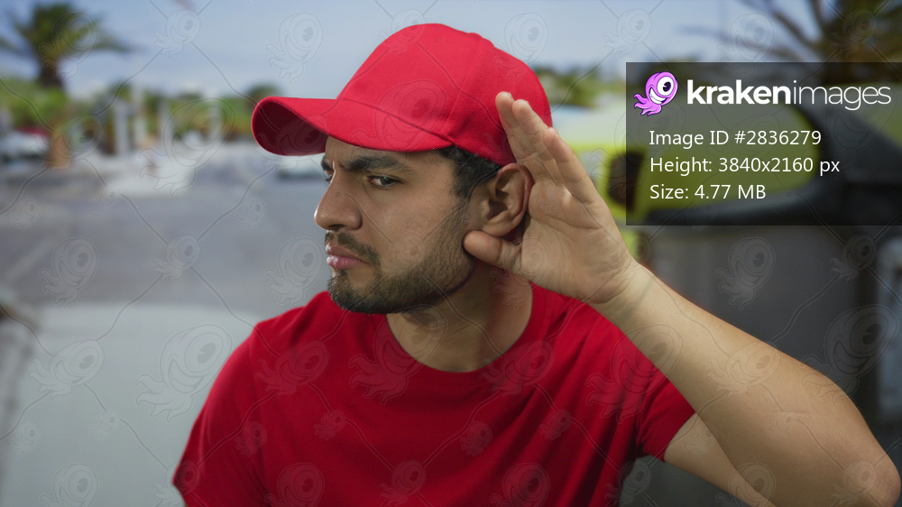 Hispanic man in red cap and tshirt cups hand to ear beside yellow recycling container on street; alertness.