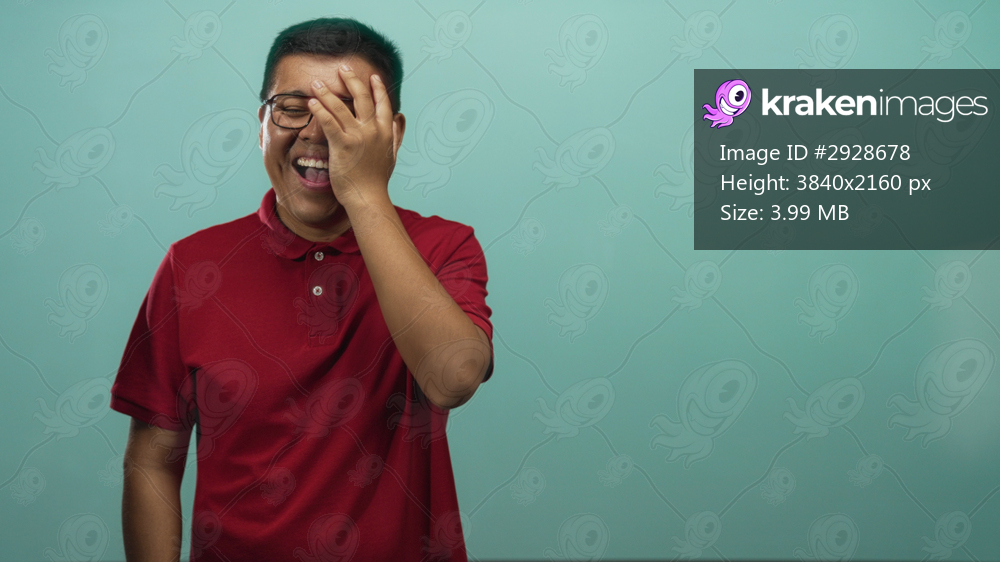 Hispanic man in red polo covering his face with hand while laughing in studio with teal backdrop; playful amusement.