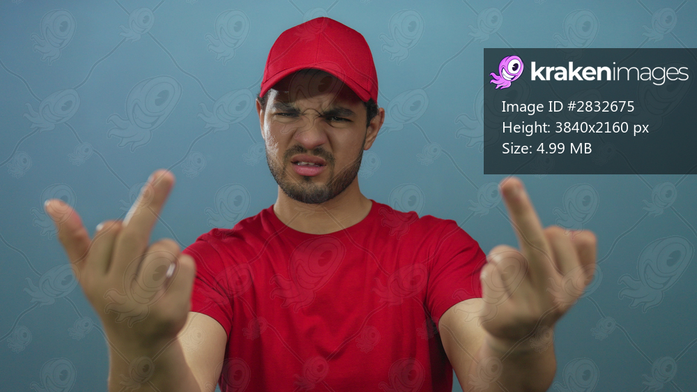Hispanic man in red shirt and cap raising two middle fingers for insult gesture in studio; defiance.
