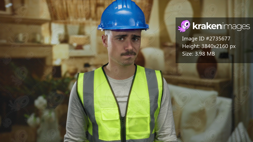 Hispanic man in reflective vest making rejection gesture indoors at a hotel setting, wearing a blue hardhat, showcasing a professional construction scene with a thoughtful expression. - Kraken Images