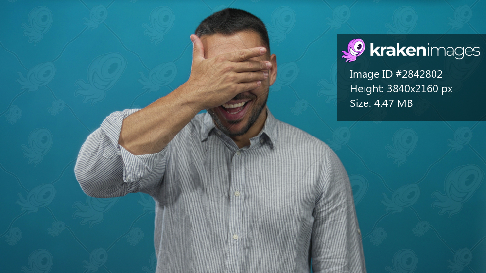 Hispanic man in striped shirt covers eyes with hand in blue studio backdrop while leaning forward and smiling; shyness.