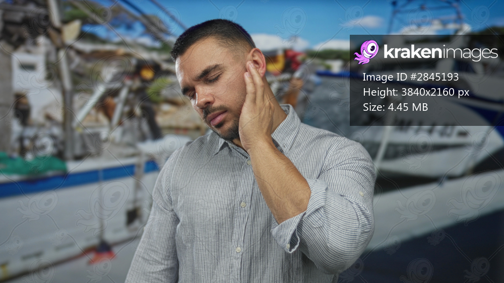 Hispanic man in striped shirt touching ear by fishing boat docked on sunny street under bright midday sunlight; discomfort.