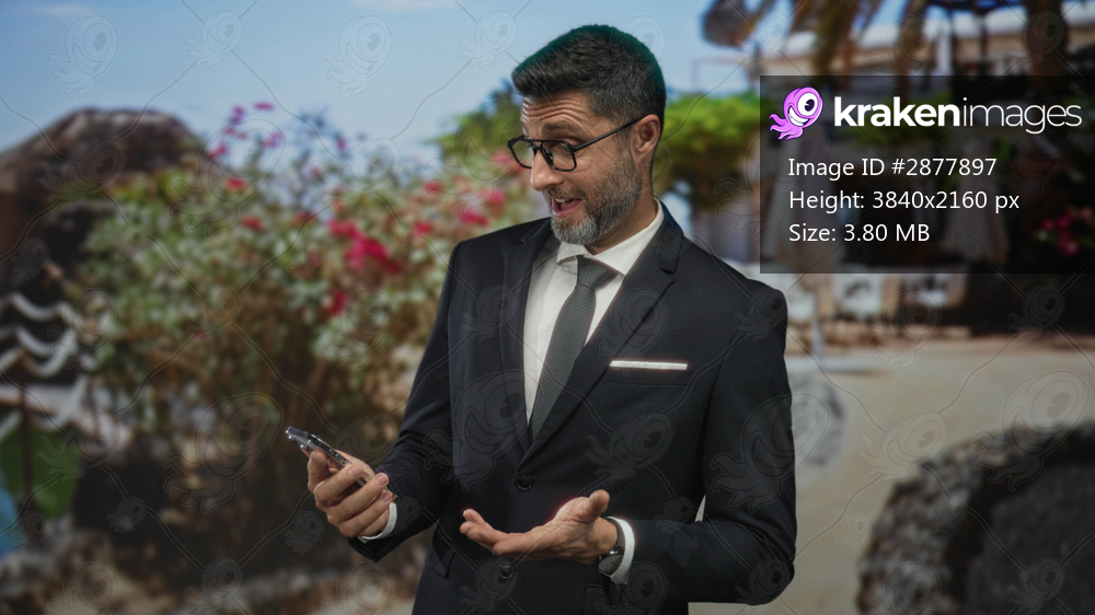 Hispanic man in suit holding smartphone and tapping screen in front of building; focused business confidence.