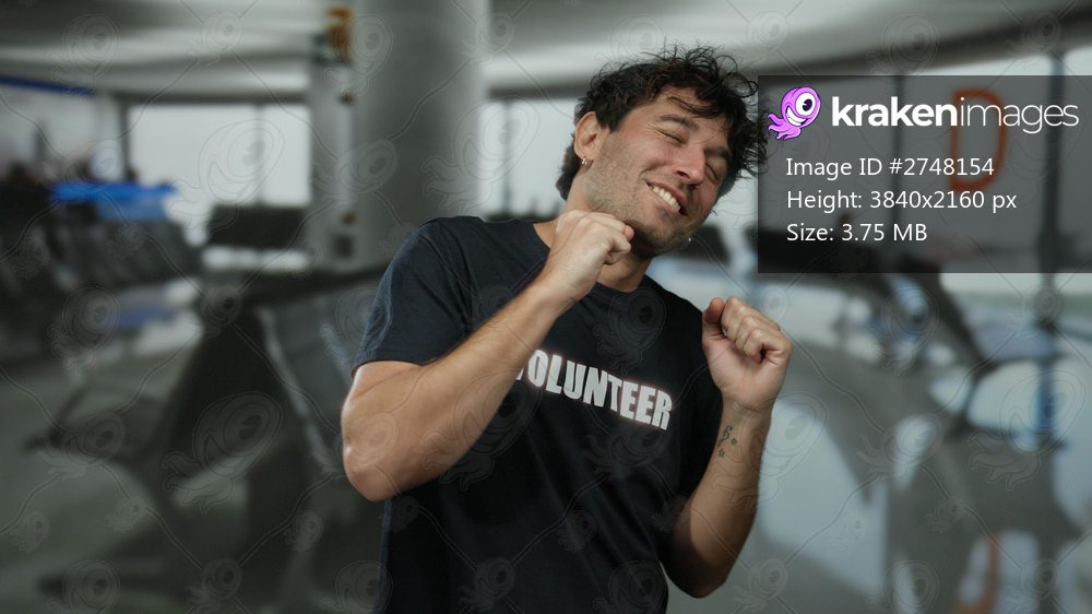 Hispanic man in volunteer shirt celebrates indoors at airport with joyful expression and closed eyes.