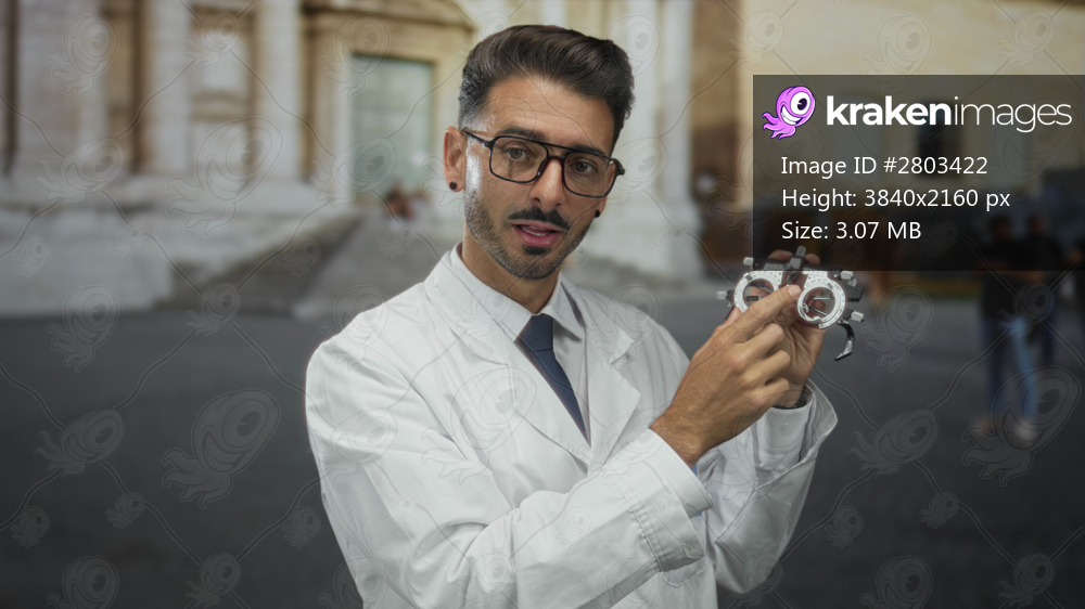 Hispanic man in white coat holding phoropter adjusting dial on cobblestone street; professional expertise.