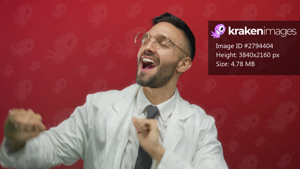 Hispanic man in white coat joyfully dancing against a vibrant red background, exuding happiness and positive energy while showcasing a cheerful moment in life. - Kraken Images