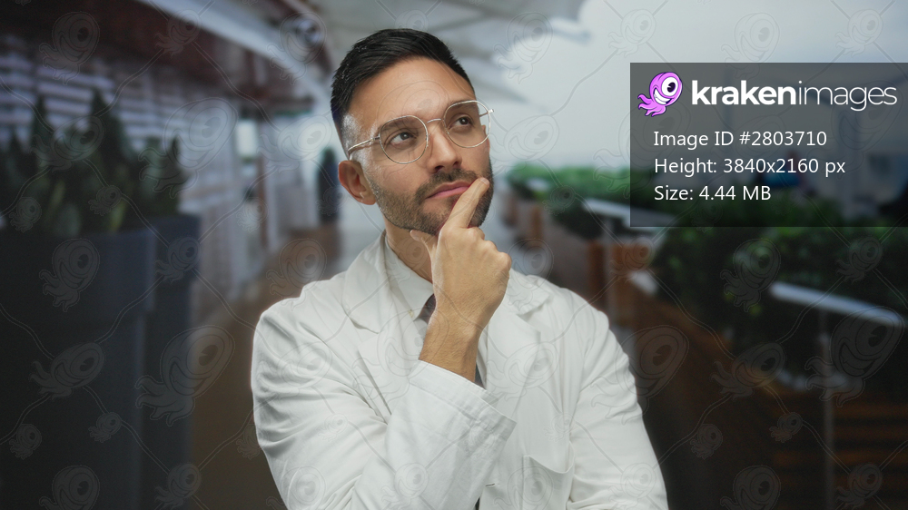 Hispanic man in white coat pondering on a restaurant terrace outdoors with tables under an overcast sky, creating a thoughtful and professional ambiance. - Kraken Images