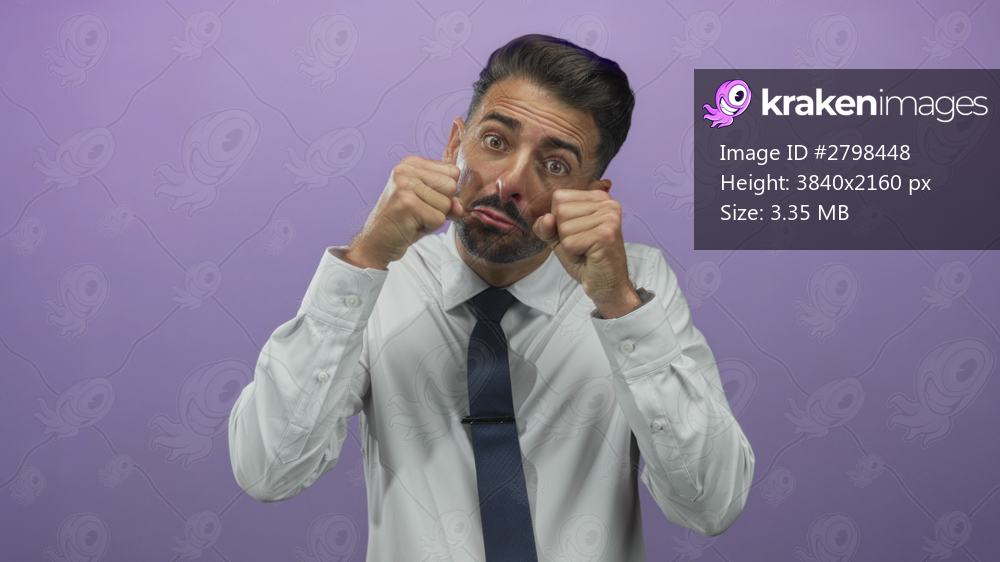 Hispanic man in white dress shirt and navy tie pulls cheeks with fists and squints eyes in studio; stress tension.