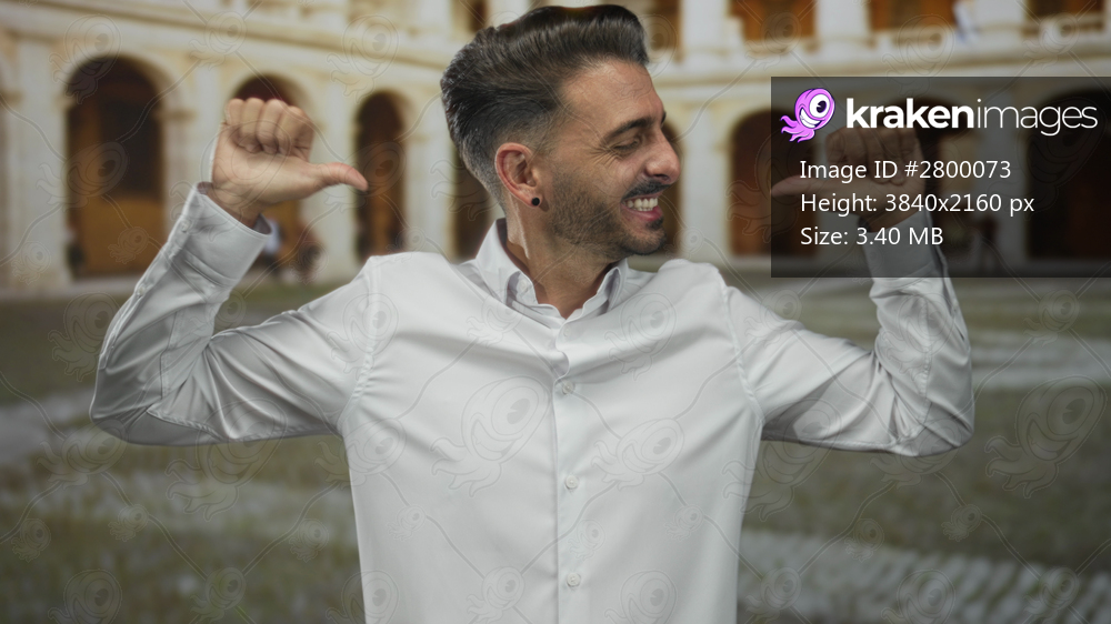 Hispanic man in white shirt with broad smile points thumbs to chest on urban historic street; confidence.
