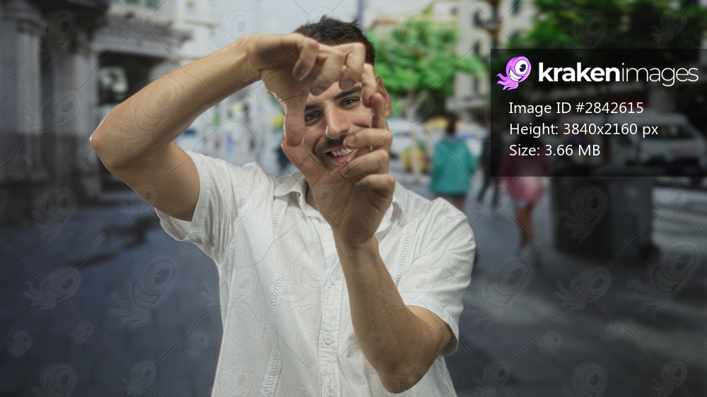 Hispanic man in white shirt frames heart shape with his hands on a busy city street in daylight; affection.