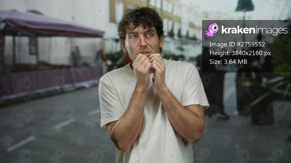 Hispanic man in white shirt looking scared on urban street expressing fear in outdoor setting with blurred background.