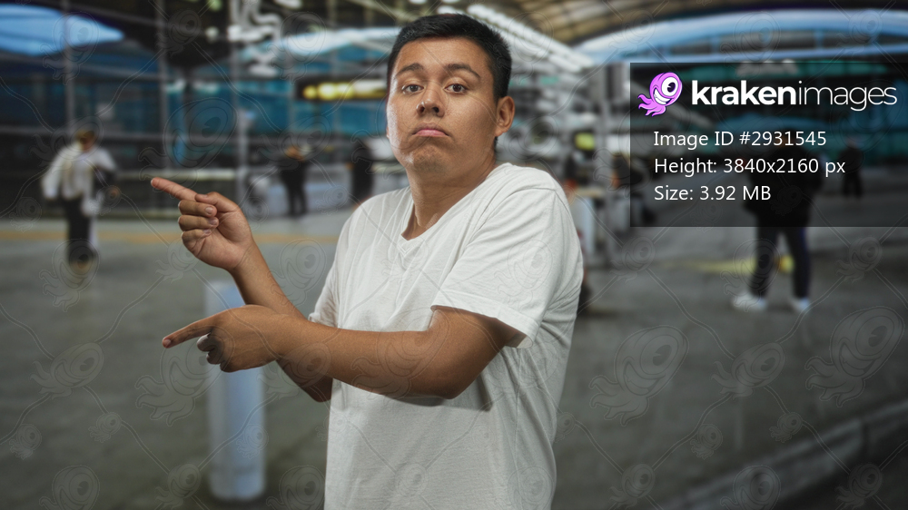 Hispanic man in white shirt pointing both index fingers outward with bare forearms visible at modern airport terminal; uncertainty.