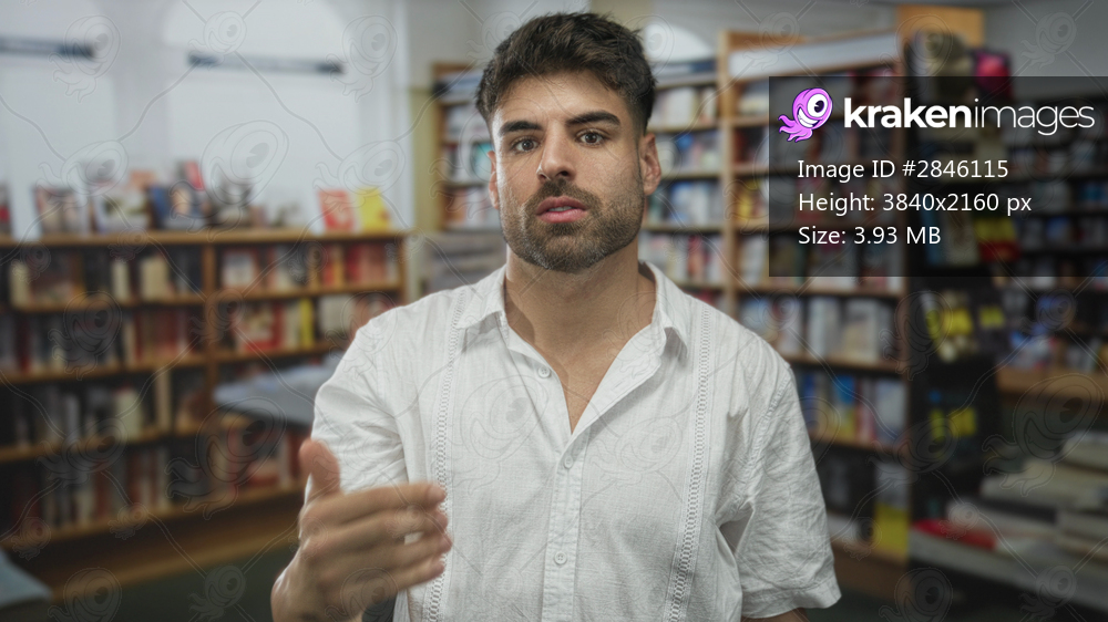 Hispanic man in white shirt points finger toward camera among bookshelves in library building aisle; invitation.