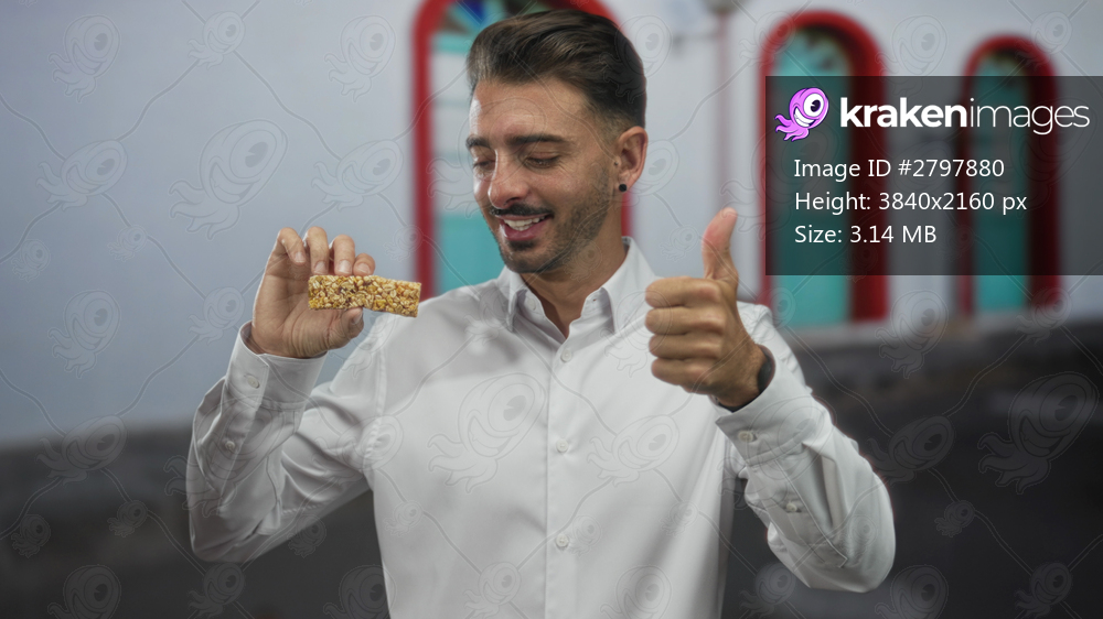 Hispanic man in white shirt smiling, holding granola bar and points finger to bar on street; satisfaction.
