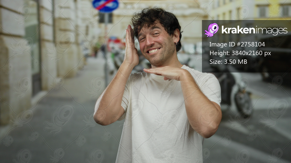 Hispanic man in white shirt smiling playfully with hands near face on a busy urban street.