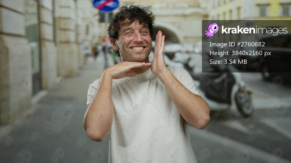 Hispanic man in white shirt smiling playfully with hands near face on a busy urban street.