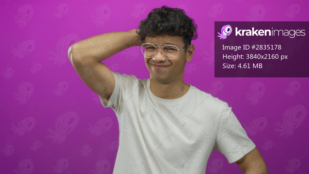 Hispanic man in white t shirt and glasses scratches head by temple with hesitant smile in studio; uncertainty.