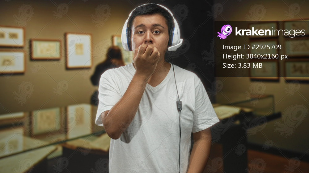 Hispanic man in white t shirt wearing gaming headset with hand to mouth biting nails inside an exhibition building among framed art and display cases; anxiety focus. - Kraken Images