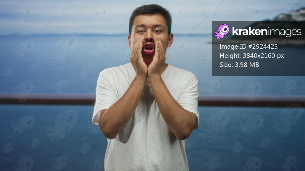Hispanic man in white tee cupping hands around mouth and calling from a seaside railing overlooking the coast; longing connection.