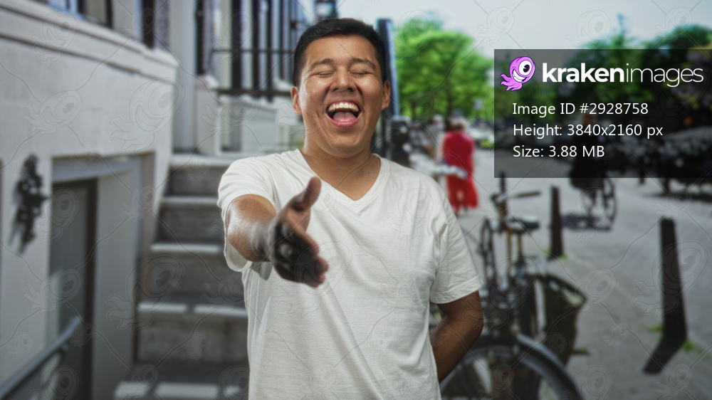 Hispanic man in white tshirt extends hand for handshake on a city street, smiling and reaching forward with bicycle lined sidewalk and stone stairs behind him; friendliness welcome. - Kraken Images