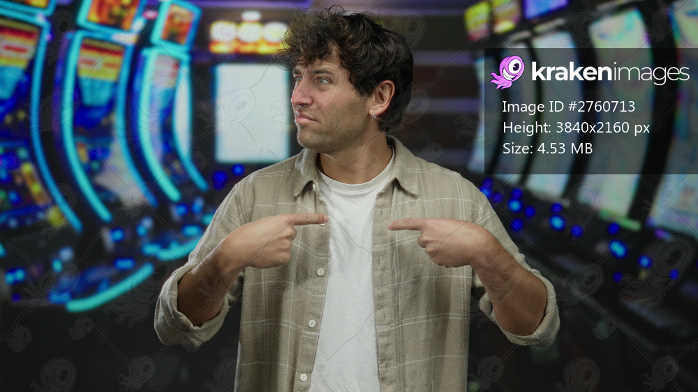Hispanic man with incredulous expression points at himself indoors at a casino surrounded by colorful slot machines, reflecting surprise and amusement. - Kraken Images