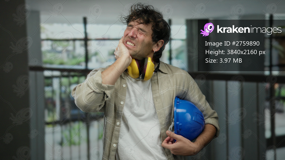 Hispanic man indoors in a building wearing noise-canceling headphones and a hardhat, expressing pain while touching his jaw, suggesting a toothache.