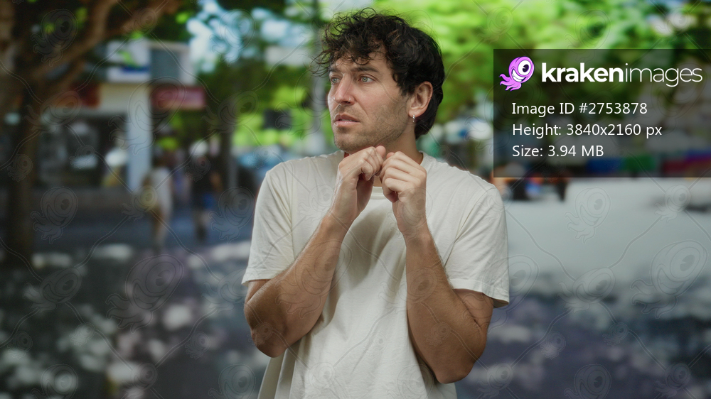 Hispanic man looks anxious standing outdoors in a sunny urban street with blurred trees in the background, suggesting a tense and uncertain moment in a public setting. - Kraken Images