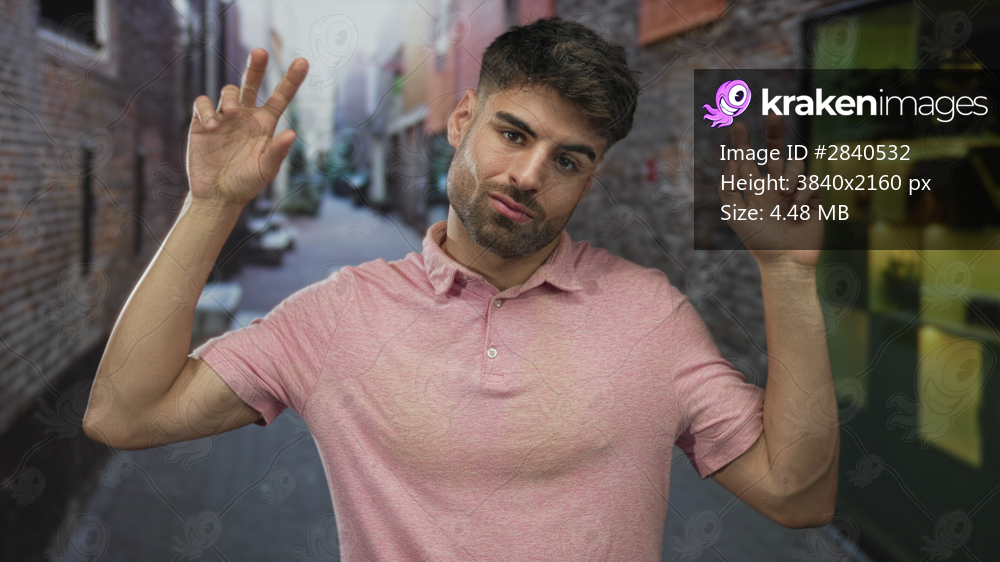 Hispanic man making air quotes gesture with fingers on narrow brick urban street in city; skepticism.