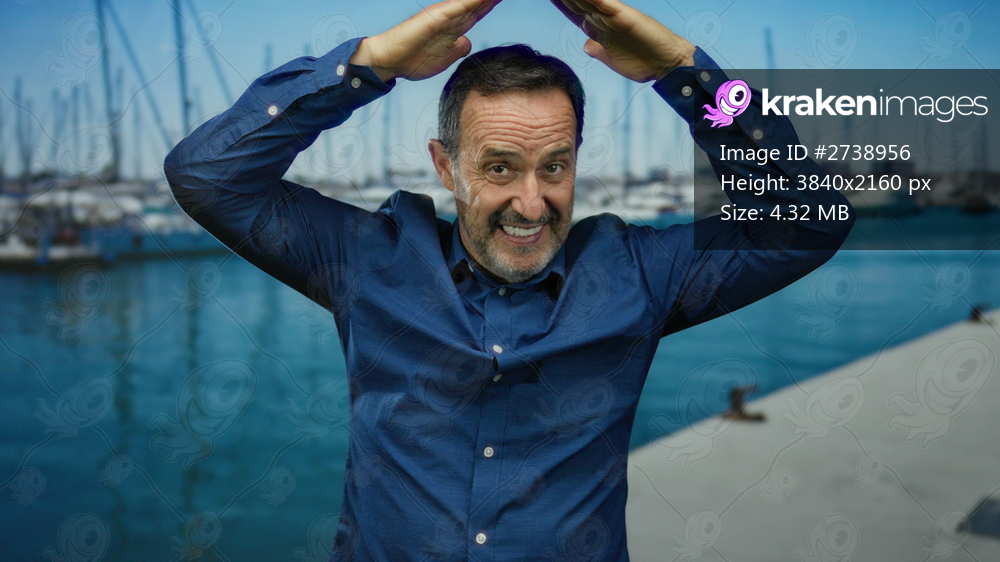 Hispanic man making gesture at seaside port with boats in the background under a clear blue sky, wearing a blue shirt while standing outdoors on a sunny day. - Kraken Images