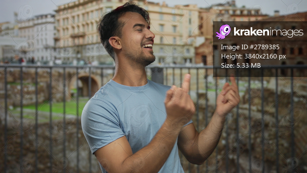 Hispanic man making gestures with middle fingers while laughing in front of roman ruins in an outdoor city setting conveys humor and irreverence.
