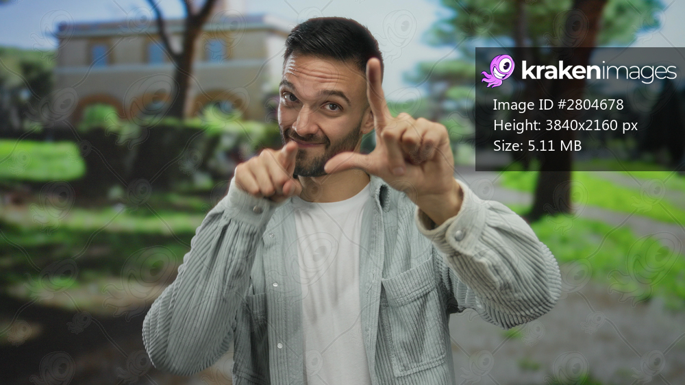 Hispanic man making loser gesture and pointing at camera outdoors in green sunny park setting surrounded by nature