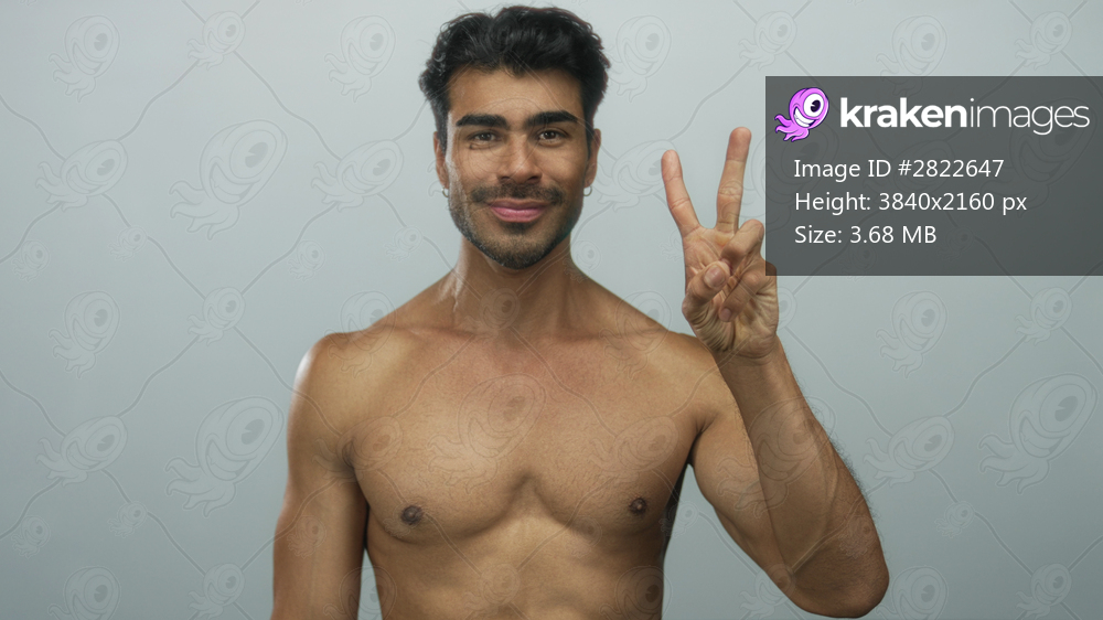 Hispanic man with muscular bare chest counting with fingers in lightblue studio on camera; confidence.