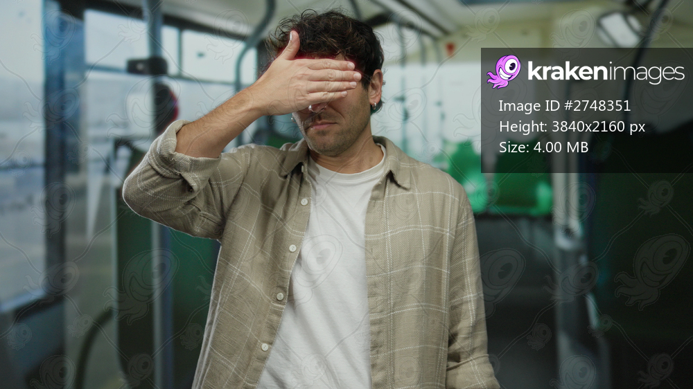 Hispanic man on a bus covering eyes indoors, conveying contemplation in a public vehicle setting, wearing casual shirt, emphasizing an urban transport environment. - Kraken Images