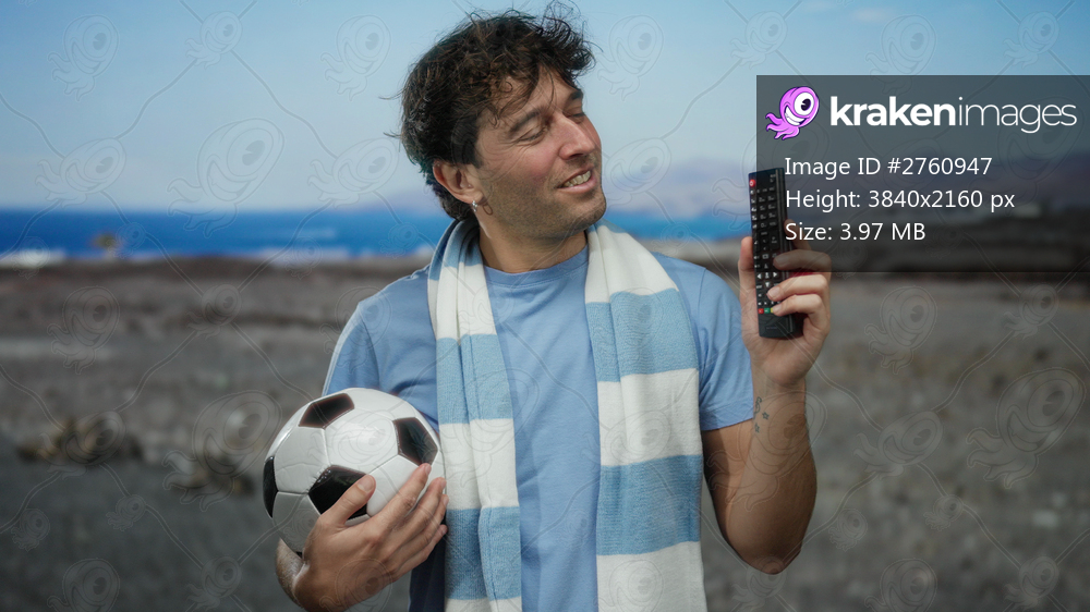 Hispanic man on beach holding football and remote, smiling in casual attire against the sea background, exudes a relaxed sports enthusiast vibe amidst coastal scenery. - Kraken Images