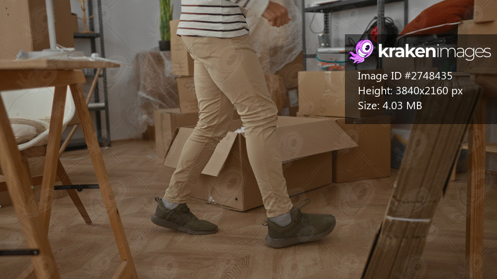 Hispanic man organizing boxes in a new home interior with visible furniture and accessories suggesting moving activities and unpacking in the living room. - Kraken Images