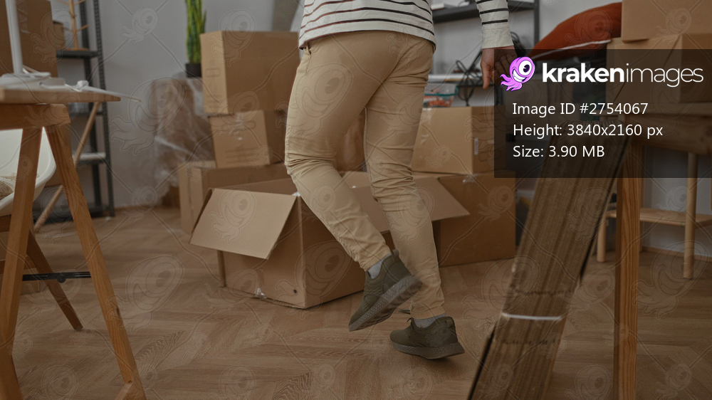 Hispanic man organizing boxes in a new home interior with visible furniture and accessories suggesting moving activities and unpacking in the living room. - Kraken Images