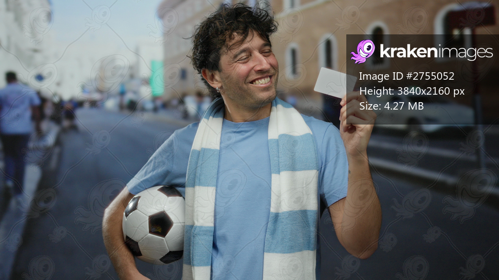 Hispanic man outdoors holding soccer ball and blank card on city street with smile showing vibrant urban sport atmosphere
