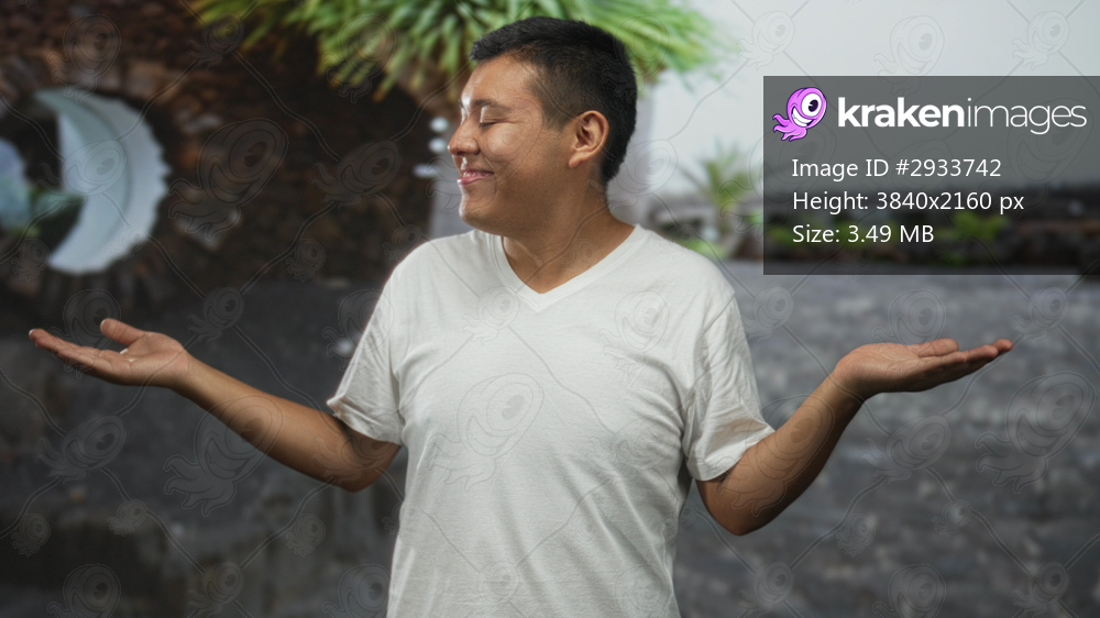 Hispanic man palms up shrugging on a street with white tee shirt, smiling and looking sideways; contentment.